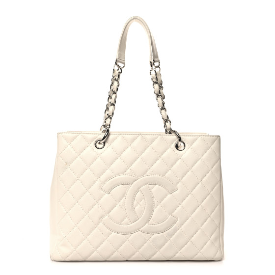 This is an authentic CHANEL Caviar Quilted Grand Shopping Tote GST in White. This tote is crafted of diamond quilted caviar leather in white. The bag features leather threaded silver chain link shoulder straps with white shoulder pads, a stitched Chanel CC logo, and a rear patch pocket. The top is open to a partitioned white fabric interior with a zipper compartment, zipper pocket, and patch pockets.