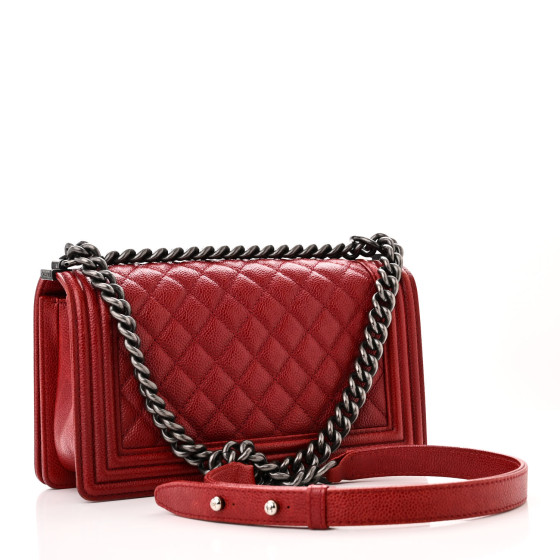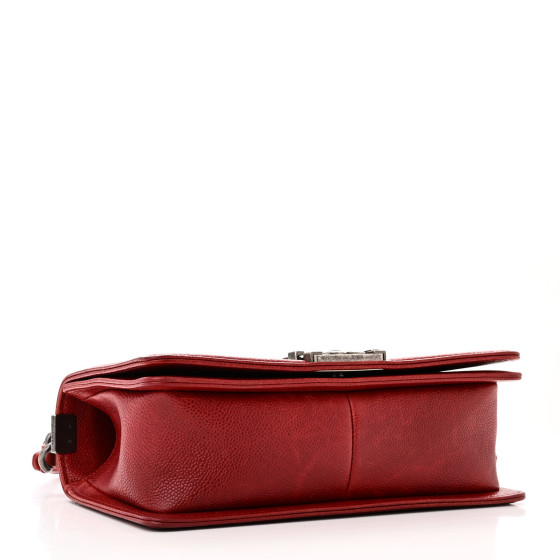This is an CHANEL Caviar Quilted Medium Boy Flap in Red. This stylish shoulder bag is crafted of luxurious diamond quilted suede like caviar leather in red. The bag features a ruthenium silver chain link shoulder strap with a broad leather shoulder pad and a ruthenium Chanel CC boy push lock. This opens to a red fabric interior with a patch pocket.