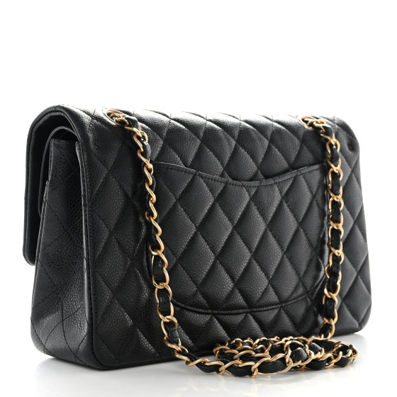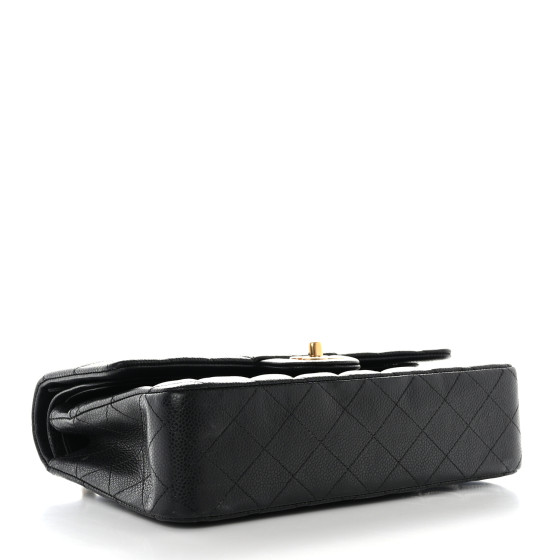 This is an CHANEL Caviar Quilted Medium Double Flap in Black. This elegant shoulder bag is crafted of luxurious caviar textured leather in black. The bag features leather threaded gold chain-link shoulder strap, a rear patch pocket, and a crossover flap with a gold classic CC turn lock. The flap opens to reveal an inner flap and a leather interior with patch pockets.