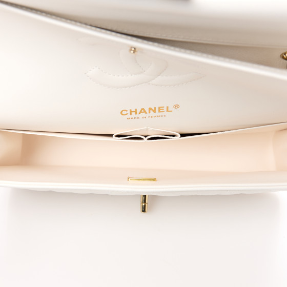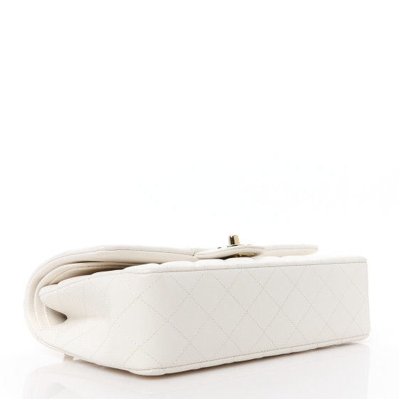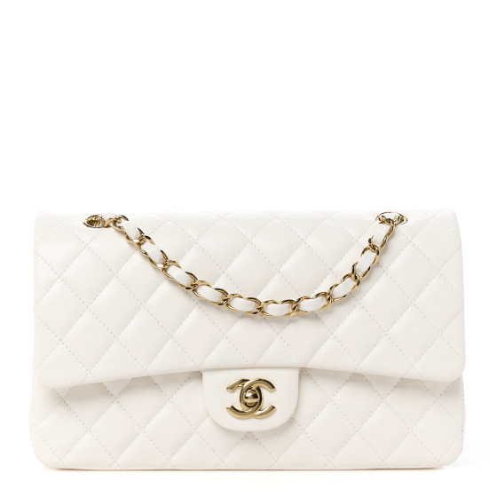 This is an CHANEL Caviar Quilted Medium Double Flap in White. This stunning shoulder bag is crafted of diamond quilted luxurious caviar leather in white. The bag features polished light gold chain link leather threaded shoulder straps, a rear patch pocket, and a facing polished light gold Chanel CC turn lock. This opens to a matte white leather interior with patch pockets.