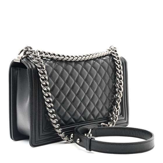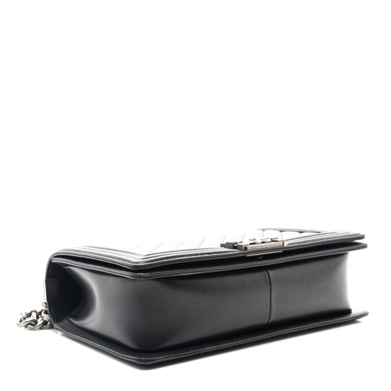 This is an CHANEL Caviar Quilted New Medium Boy Flap in Black. This stylish shoulder bag is crafted of luxuriously soft diamond quilted lambskin leather with linear quilted borders in black. The bag features a ruthenium chain link shoulder strap with a leather shoulder pad and a ruthenium Chanel boy CC push lock. This opens the full flap to a black fabric interior with zipper and flat pockets.