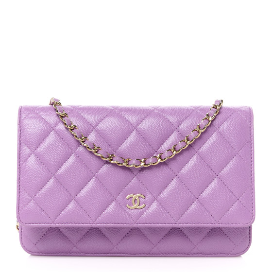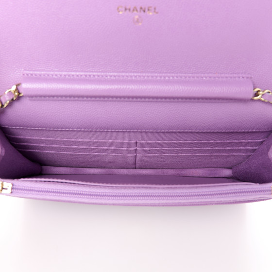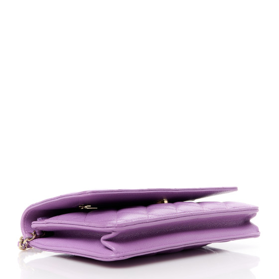 This is an CHANEL Caviar Quilted Wallet On Chain WOC in Purple. This chic wallet on chain is crafted of diamond quilted caviar leather in purple. The wallet features a polished gold chain link leather threaded shoulder strap and gold Chanel CC logo on the flap. This opens with a snap to a fabric interior with card slots, patch pockets, and a zipper compartment.