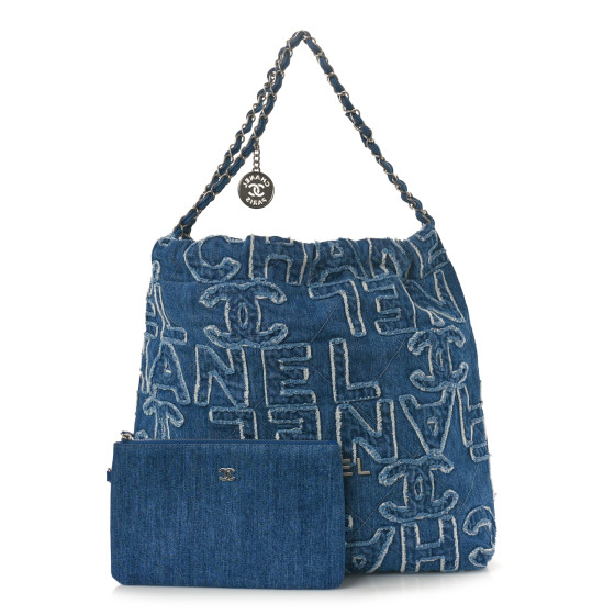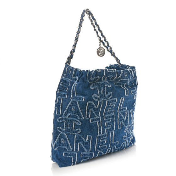 CHANEL Stitched Denim Patchwork Quilted Chanel 22 in Blue. This shoulder bag features a blue denim patchwork fabric with Chanel logo throughout in silver metal on the front, and denim threaded chain strap that cinches the top as well. The bag opens to a navy blue fabric interior with zipper pocket and removable pouch.