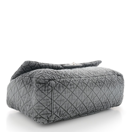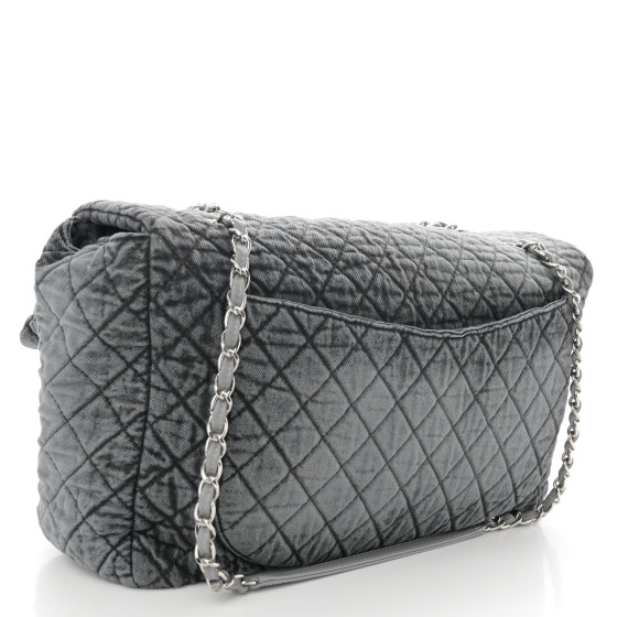 CHANEL Denim Quilted Denimpression XXL Flap in Grey and Black. This stylish flap bag is crafted in diamond quilted denim. The bag features a silver leather bijoux chain shoulder straps and a matching facing chanel logo turn lock. This opens the flap to a matching denim fabric interior with patch pockets.
