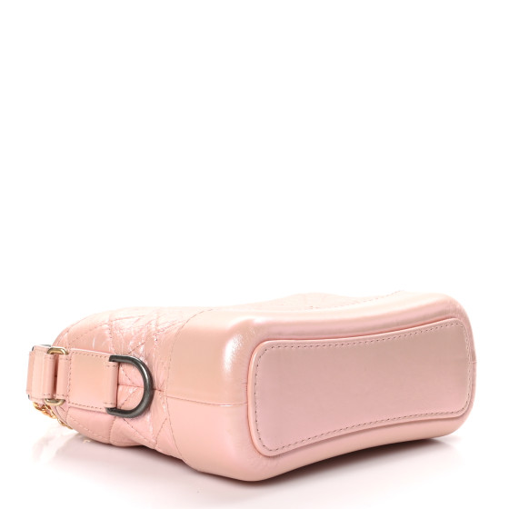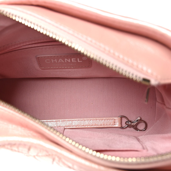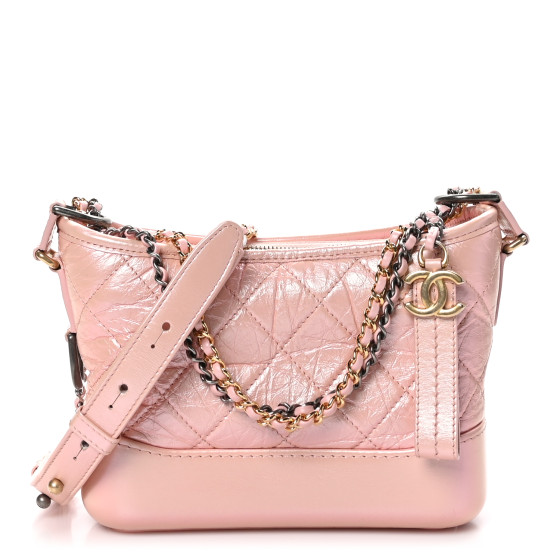 This is an CHANEL Iridescent Aged Calfskin Quilted Small Gabrielle Hobo in Rose. This chic shoulder bag is constructed of diamond stitched aged calfskin leather in an iridescent light pink with a smooth matching calfskin base. The crossbody bag features thin ruthenium, gold, and silver chain link leather threaded shoulder straps with a leather shoulder pad. The top zipper opens to a fabric interior with zipper and patch pockets.