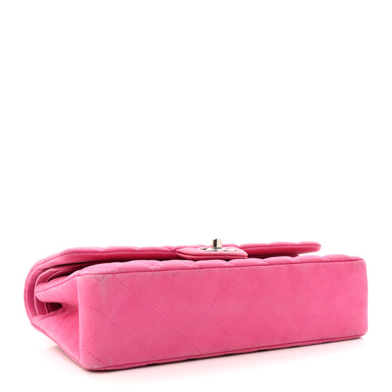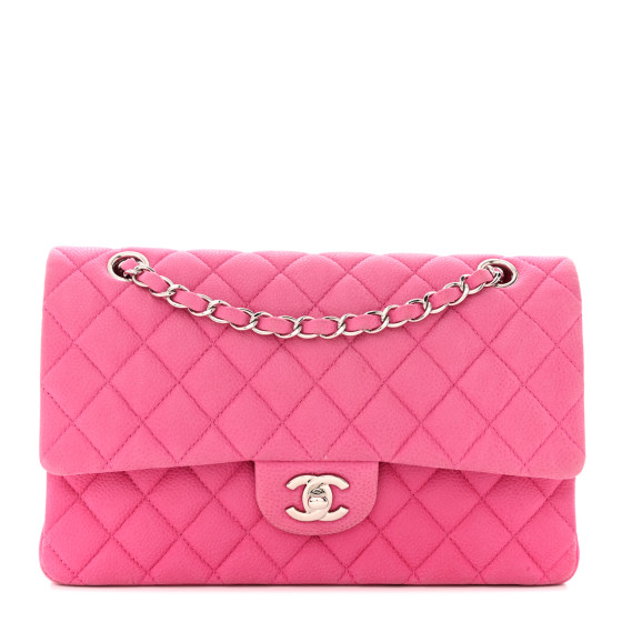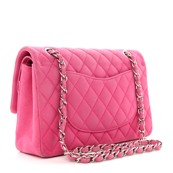 This is an CHANEL Iridescent Caviar Quilted Medium Double Flap in Pink. This classic flap bag is crafted of tonal pink leather. The bag features a silver chain-link shoulder strap threaded with leather, a crossover flap, and a silver Chanel CC turn-lock on the front. The flap opens to reveal an inner flap compartment, single zip pocket and a patch pocket at back exterior.