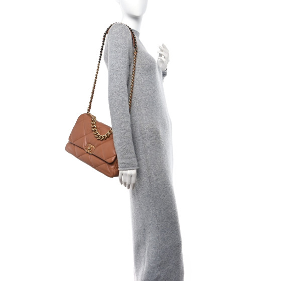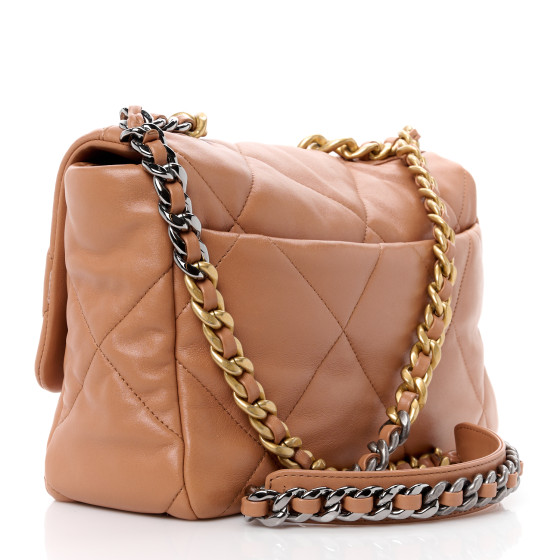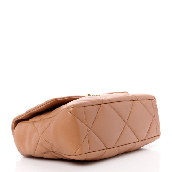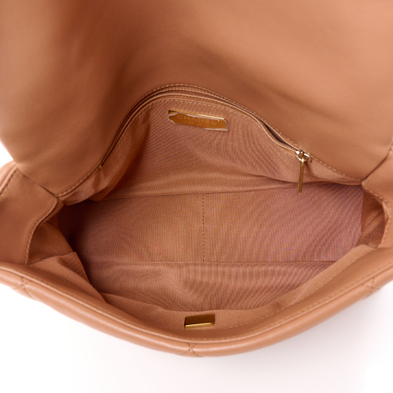 This is an CHANEL Lambskin Quilted Large Chanel 19 Flap in Brown. This stylish shoulder bag is crafted of diamond quilted lambskin leather in caramel brown. The refined bag features an aged gold embellished Chanel CC turn-lock on the flap and a leather threaded aged gold, dark silver, and ruthenium chain-link shoulder strap with a shoulder pad. The front flap opens to a fabric interior with a zipper pocket