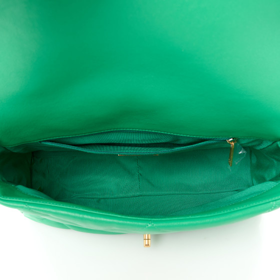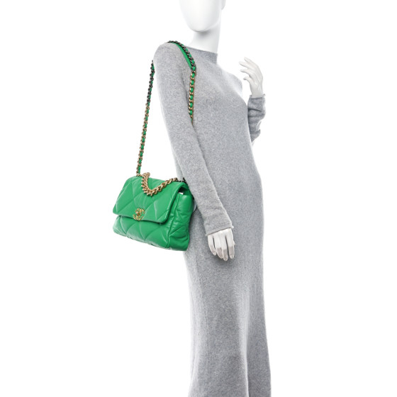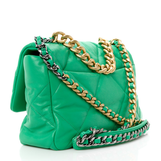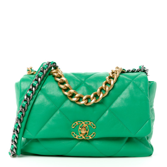 This is an CHANEL Lambskin Quilted Large Chanel 19 Flap in Green. This pillowy soft shoulder bag is crafted of oversized quilted lambskin leather in green. The refined bag features a chain detail CC turn lock on the flap, a magnetic snap pocket at the rear, and a leather threaded aged gold, ruthenium, and dark silver chain link shoulder strap with a leather shoulder pad. The front flap opens to a matching fabric interior with a zipper pocket.