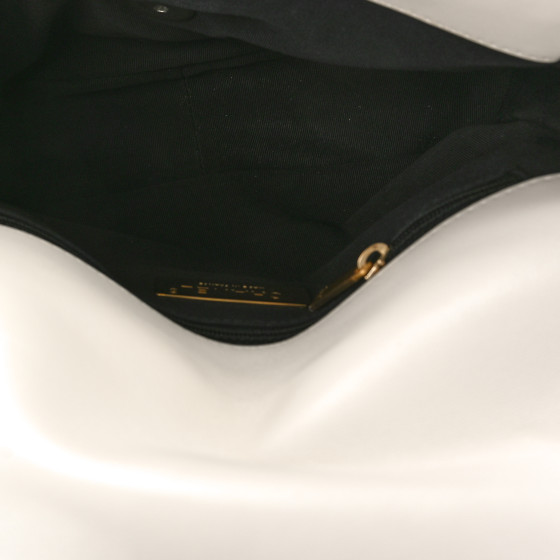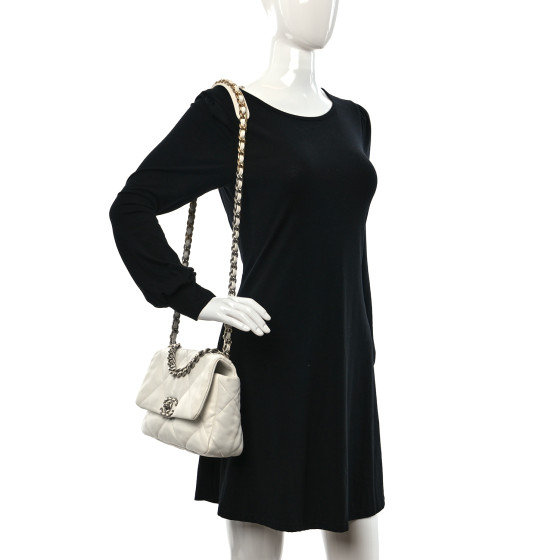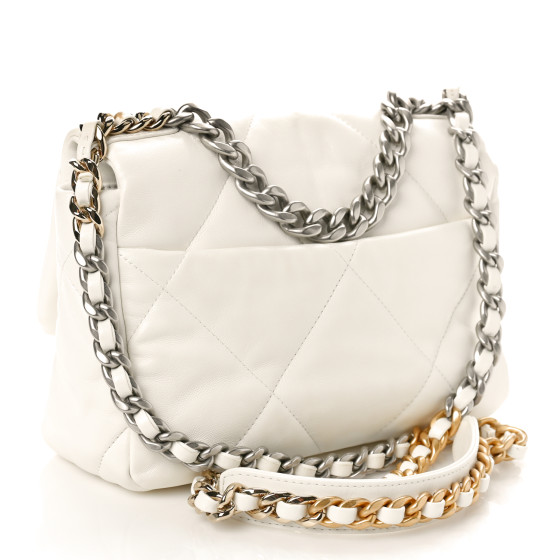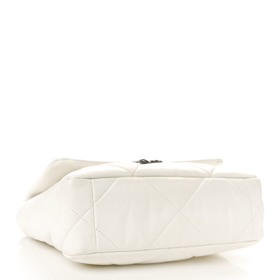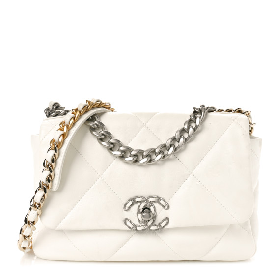 This is an CHANEL Lambskin Quilted Medium Chanel 19 Flap in White. This pillowy soft shoulder bag is crafted of oversized quilted lambskin leather in white. The refined bag features an aged silver chain detail CC turn-lock on the flap, a magnetic snap pocket at the rear, and a leather threaded gradient gold to ruthenium chain-link strap with a leather shoulder pad. The front flap opens to a black fabric interior with a zipper pocket.