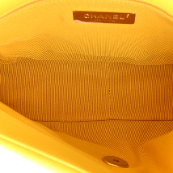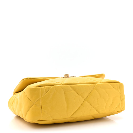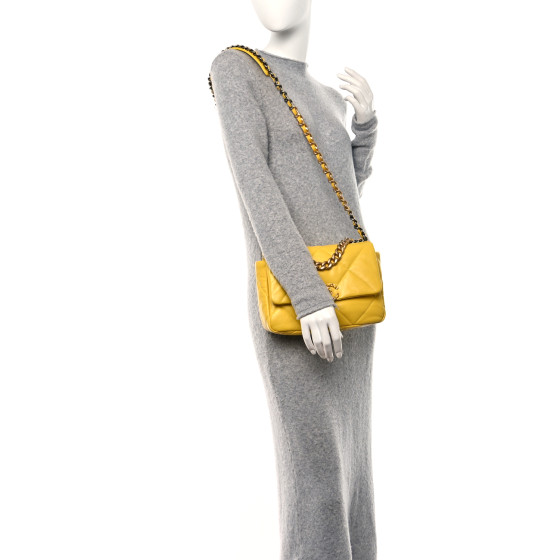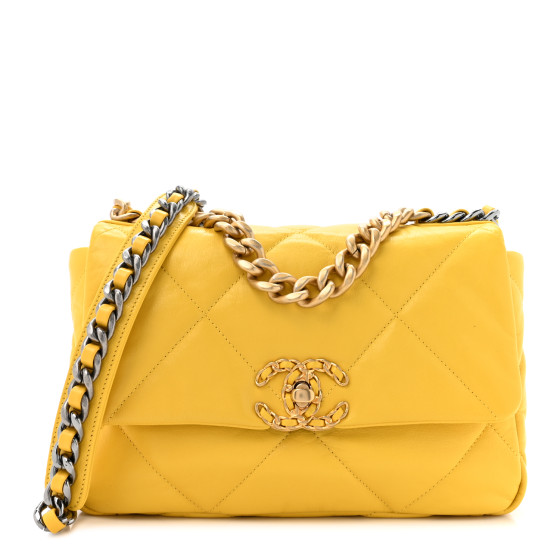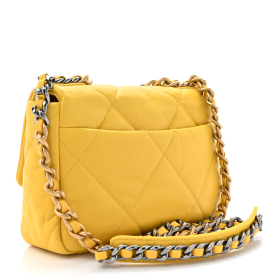 This is an CHANEL Lambskin Quilted Medium Chanel 19 Flap in Yellow. This stylish shoulder bag is crafted of diamond quilted lambskin leather in yellow. The refined bag features a Chanel CC embellishment on the flap, a rear pocket and a leather threaded aged gold, polished silver and ruthenium chain link shoulder strap with a shoulder pad. The front flap opens to a yellow leather and fabric interior with a zipper pocket.