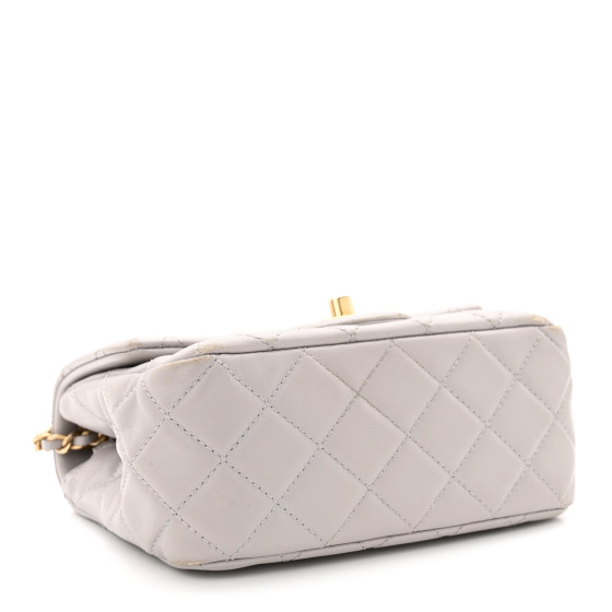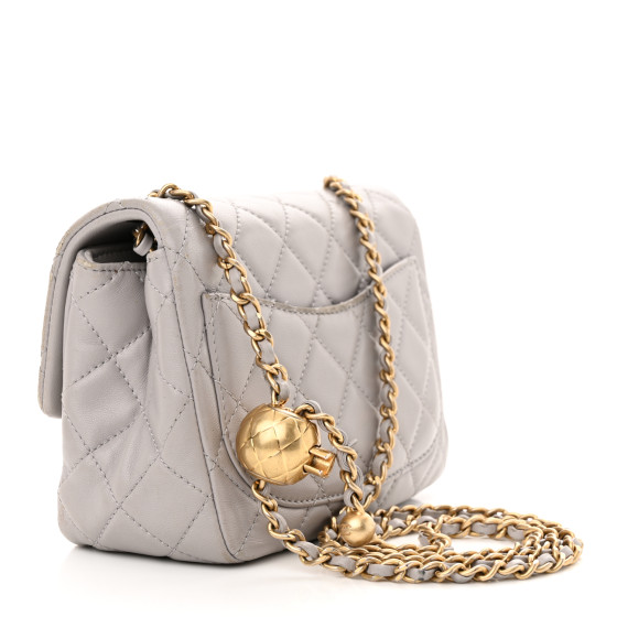 This is an CHANEL Lambskin Quilted Mini Pearl Crush Flap in Light Grey. This chic crossbody flap bag is crafted of soft diamond-quilted lambskin leather in grey. The bag features an aged gold chain-link shoulder strap threaded with leather that has a round gold cinch adjustment. The crossover flap opens with a Chanel CC turn-lock to a metallic gold leather interior with a zipper and patch pocket.