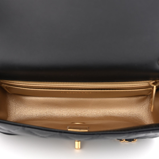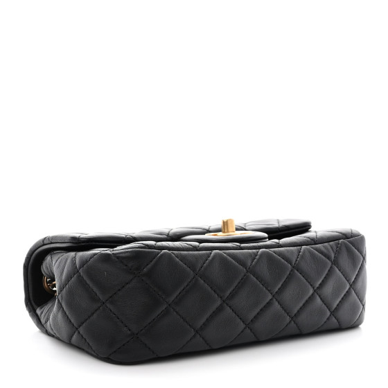 This is an CHANEL Lambskin Quilted CC Pearl Crush Mini Rectangular Flap in Black. The chic mini crossbody classic is crafted in soft quilted lambskin leather in black. The bag features an aged gold chain link leather threaded shoulder strap with a strap adjuster and a facing classic aged gold CC turn lock. This opens the flap to a gold leather interior with zipper and patch pockets.