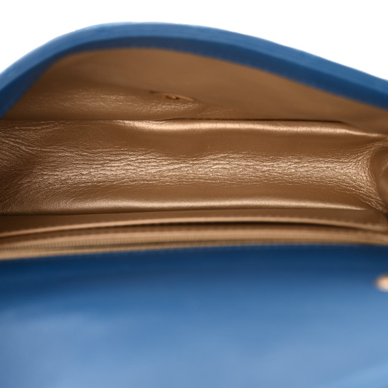 This is an CHANEL Lambskin Quilted CC Pearl Crush Mini Rectangular Flap in Blue. The chic mini crossbody classic is crafted in soft quilted lambskin leather in blue. The bag features a gold chain link leather threaded shoulder strap and a facing classic gold CC turn lock. This opens the flap to a gold leather interior with zipper and patch pockets.