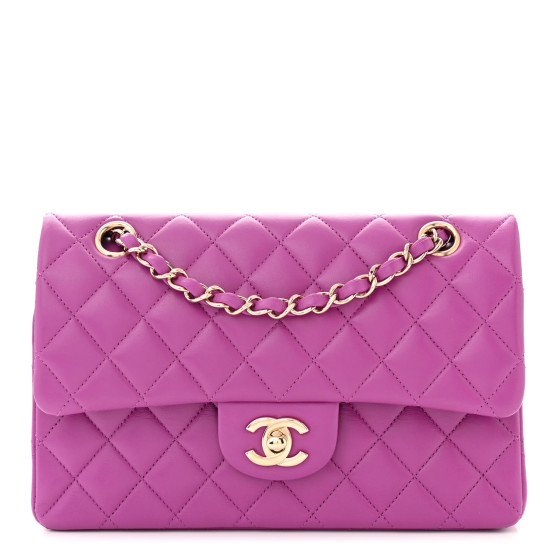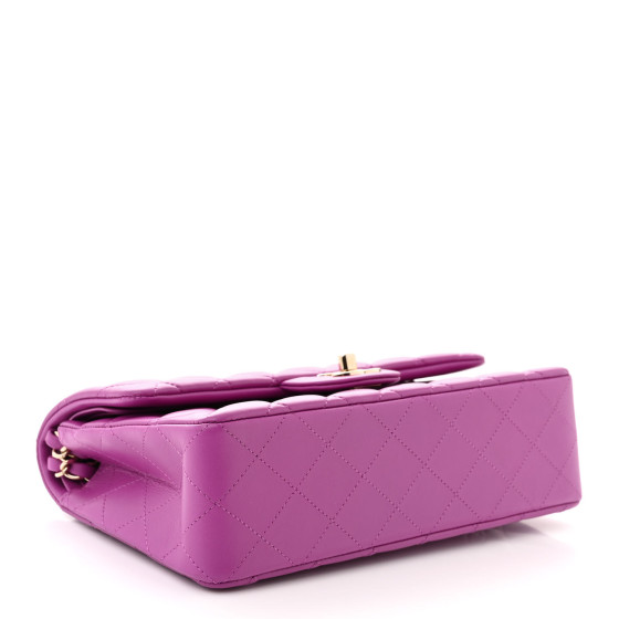 This is an CHANEL Lambskin Quilted Small Double Flap in Purple. This classic shoulder bag is crafted of diamond quilted luxuriously soft lambskin leather in purple. It features gold chain link shoulder straps threaded with leather and a gold Chanel CC turn lock on front flap. The bag opens to an inner flap and matching leather interior with patch pockets.