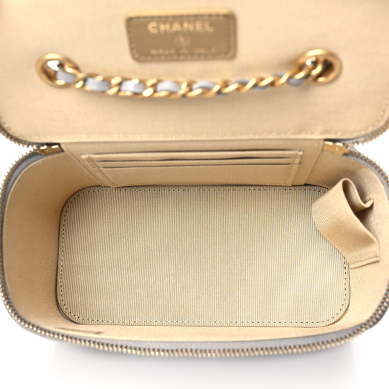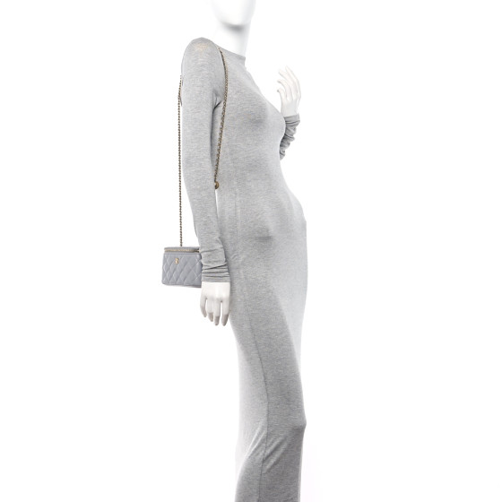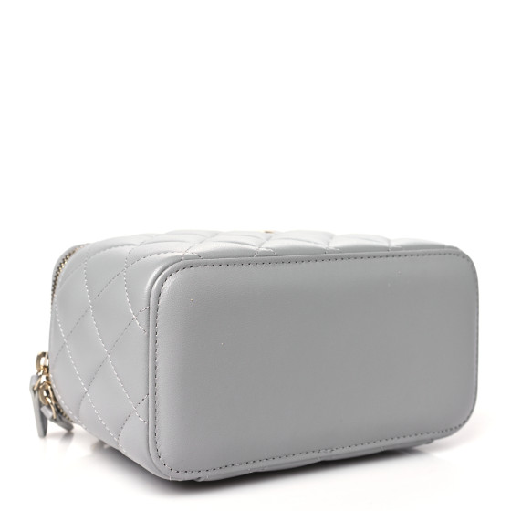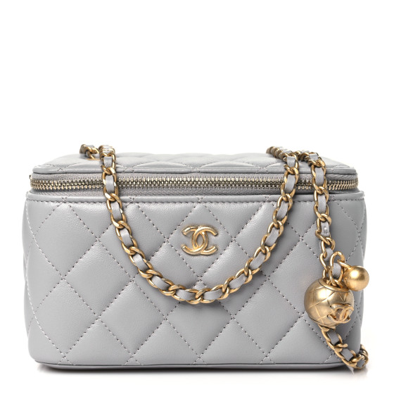 This is an CHANEL Lambskin Quilted Small Pearl Crush Vanity Case With Chain in Grey. This stylish crossbody is crafted of quilted lambskin in grey. The bag features a leather-threaded aged gold chainlink shoulder strap with adjustment bauble and a gold CC logo on the front. The 3/4 wrap-around zipper opens to a gold fabric interior with card slots and a lipstick slot.