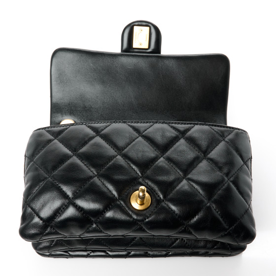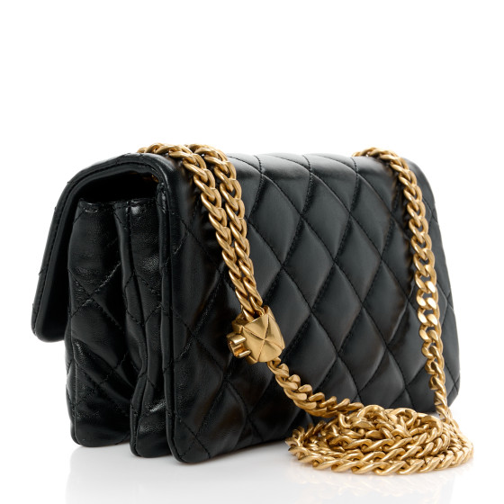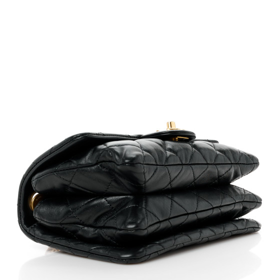CHANEL Lambskin Quilted Small Pillow Crush Flap in Black. This petite shoulder bag is crafted of diamond-quilted lambskin leather in black. The bag features a leather-threaded gold chain shoulder strap and a flap with a gold Chanel CC turn-lock. This opens to a black fabric interior with patch and zippered pockets.