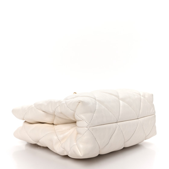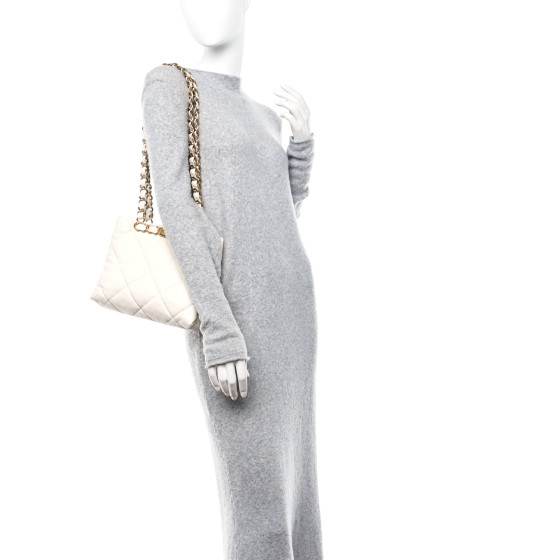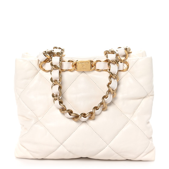 CHANEL Lambskin Quilted Small Shopping Bag in White. This stylish tote bag is crafted of diamond-quilted calfskin leather in white. It features leather threaded gold chain shoulder straps and matching trim along the top edge with a CC logo. The top opens to a partitioned fabric interior with zipper and patch pockets.