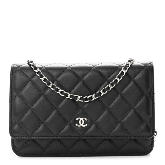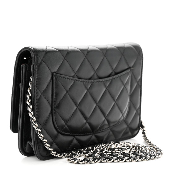 This is an CHANEL Lambskin Quilted Wallet On Chain WOC in Black. This chain wallet is crafted of diamond quilted lambskin leather in black. The bag features a silver chain link leather threaded crossbody strap and a facing flap with a small matching silver Chanel CC logo. The flap opens to a burgundy fabric and leather interior with card slots, a zipper compartment, and a leather patch pocket.