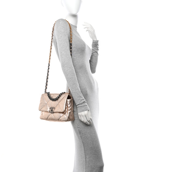 This is an CHANEL Metallic Lambskin Quilted Medium Chanel 19 Flap in Gold. This pillowy soft shoulder bag is crafted of oversized quilted lambskin leather in gold. The refined bag features a chain detail CC turn-lock on the flap, a magnetic snap pocket at the rear, and a leather threaded aged gold, ruthenium, and dark silver chain-link shoulder strap with a leather shoulder pad. The front flap opens to a matching gold fabric interior with a zipper pocket.