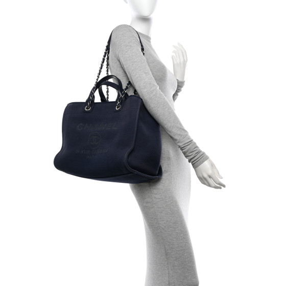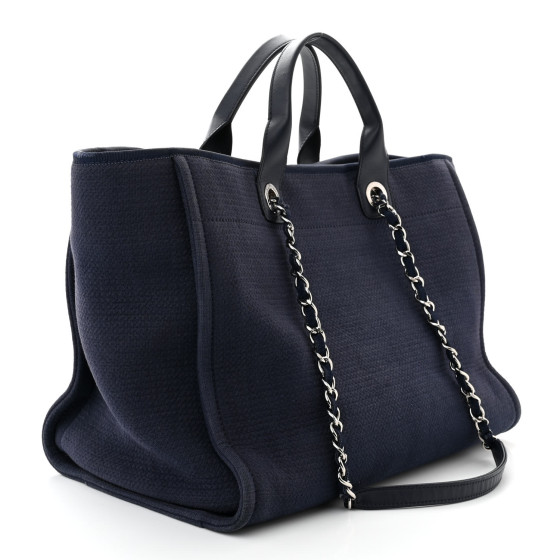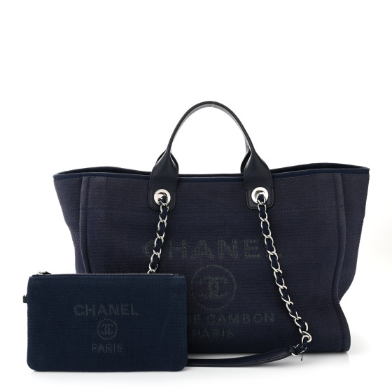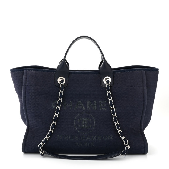 CHANEL Mixed Fibers Calfskin Medium Deauville Tote in Dark Blue. This lovely tote is crafted of fine dark blue canvas, with a Chanel advertisement logo printed on the front. The bag features navy blue leather top handles and removable fabric-threaded polished silver chain-link shoulder straps. The wide top is open to a dark blue fabric interior with pockets.