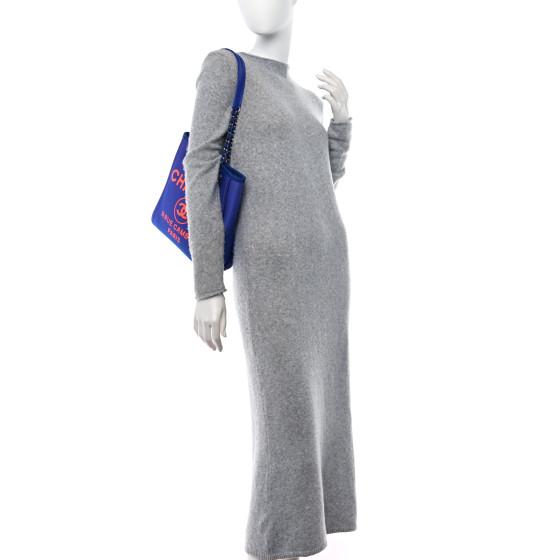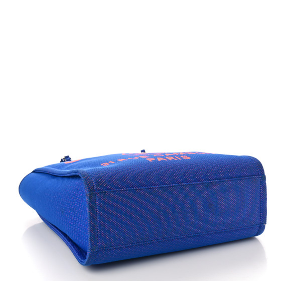 CHANEL Mixed Fibers Mini Deauville Tote in Blue Orange. This lovely tote is crafted of blue canvas with an orange Chanel advertisement logo. The bag features silver chain link fabric threaded shoulder straps. The wide top opens to a orange fabric interior with zipper and patch pockets.