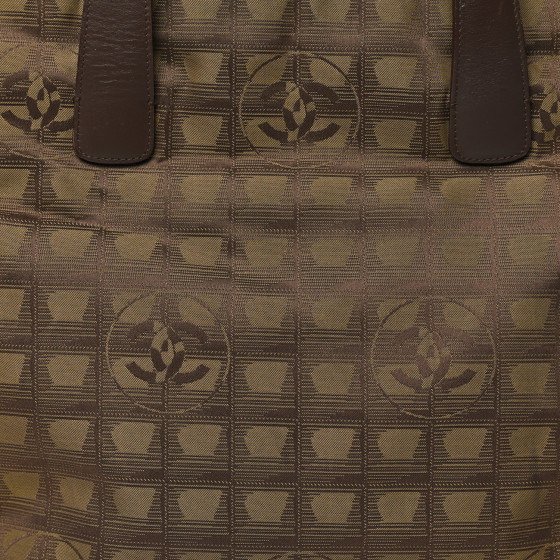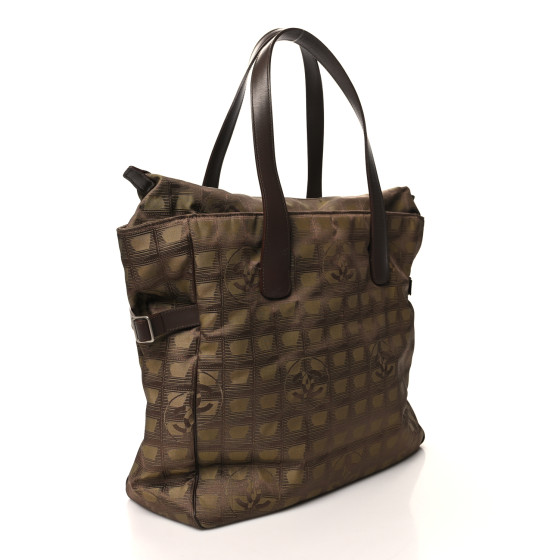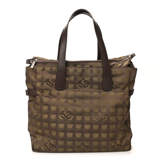 CHANEL Nylon Travel Large Tote in Khaki. This casual tote is beautifully created of fine nylon jacquard with trompe l’oeil style faux quilting. The bag features cowhide leather top handles and Chanel CC logo impressions across the bag. The top opens to a nylon interior with zipper pockets.
