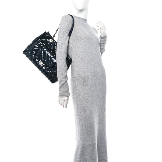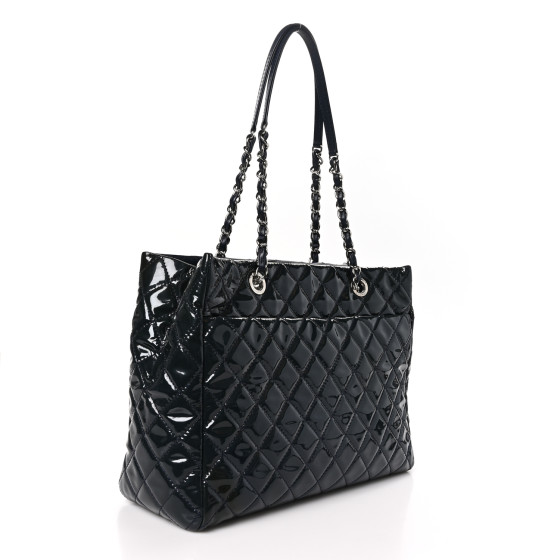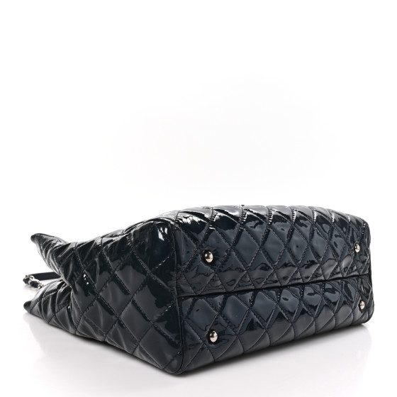 CHANEL Patent Quilted Large Coco Shine Shopping Tote in Navy. This stylish tote is crafted of diamond quilted patent leather in dark blue. The bag features leather-threaded silver chainlink shoulder straps with leather shoulder pads and a silver Chanel CC turn-lock on the front flap pocket. The top is open to a red fabric interior with zipper and patch pockets.