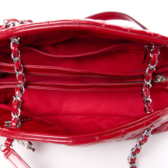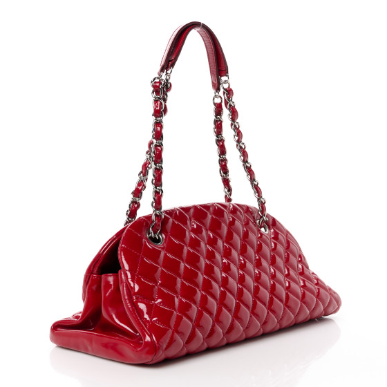 CHANEL Patent Quilted Medium Just Mademoiselle Bowling Bag in Red. This stunning handbag is beautifully crafted of diamond quilted bright red patent leather-trimmed with silver chain link top handles threaded with leather and a dangling silver Chanel CC medallion. The top is open to a red fabric interior with multiple compartments and a zippered section. This bag versatile bag will take you from day to evening with a look that is classic and chic, only from Chanel!