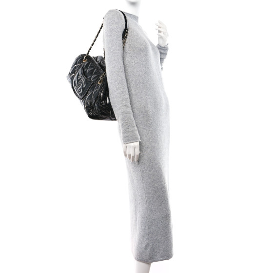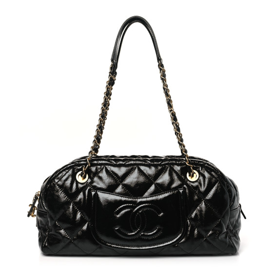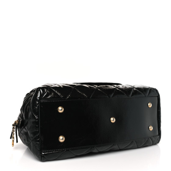 CHANEL Shiny Aged Calfskin Quilted Bowler Medium Bag in Black. This stylish tote is crafted of padded glazed calfskin leather in black. The bag features an exterior patch pocket and leather threaded aged gold chain shoulder strap with leather shoulder pads. The top zipper opens to a black fabric interior with zipper and patch pockets.