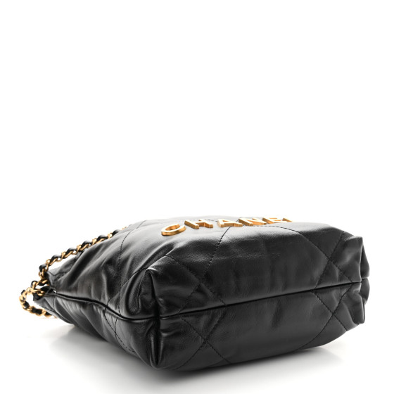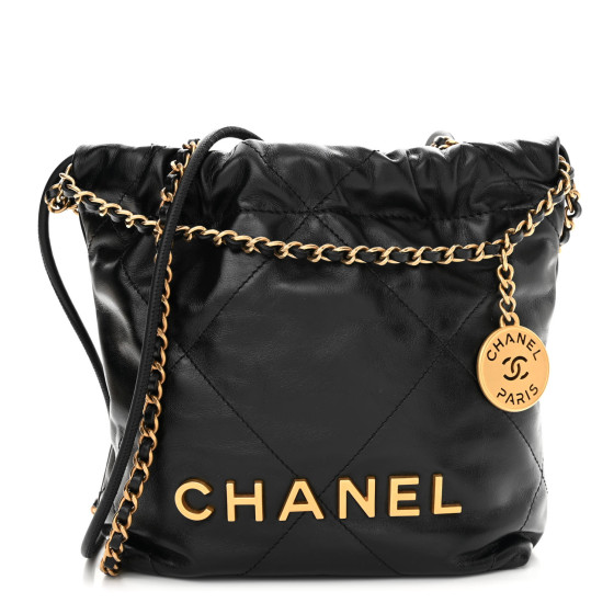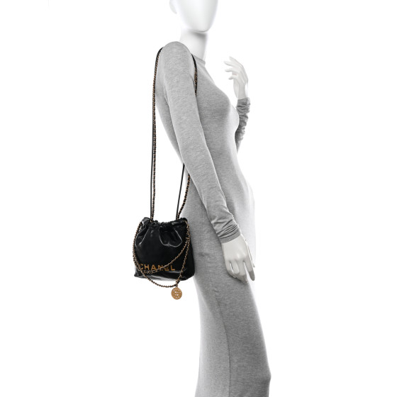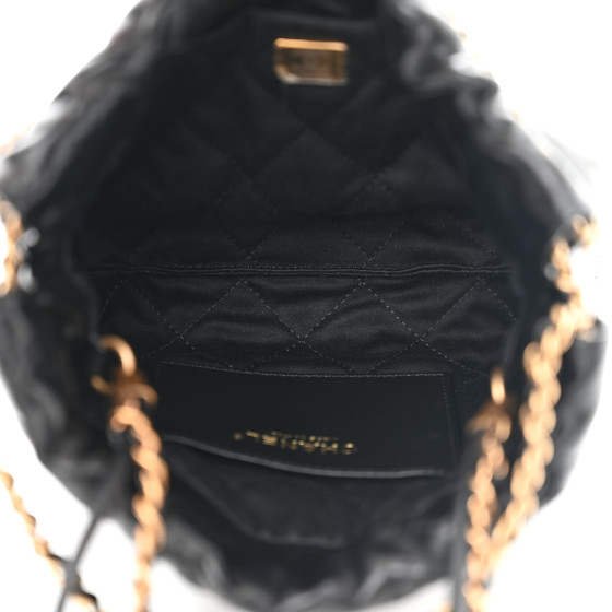 This is an CHANEL Shiny Calfskin Quilted Mini Chanel 22 in Black. This chic bag is crafted diamond-stitched shiny calfskin leather in black. The bag features a leather threaded aged gold chain link shoulder strap with an accompanying rolled black leather shoulder strap, and shorter leather-threaded chainlink straps that double as a drawstring top. The bag opens to a diamond quilted fabric interior with a leather flat pocket.