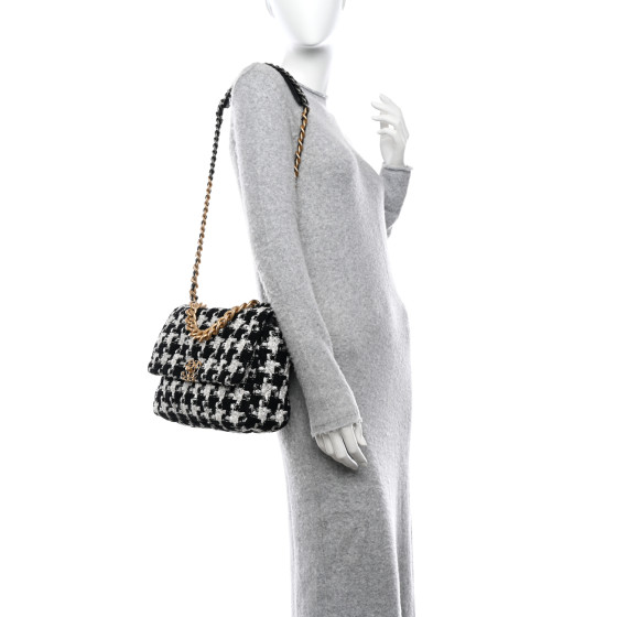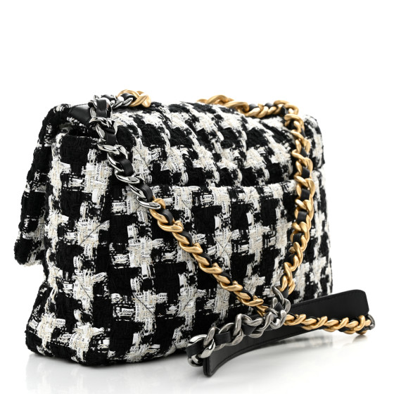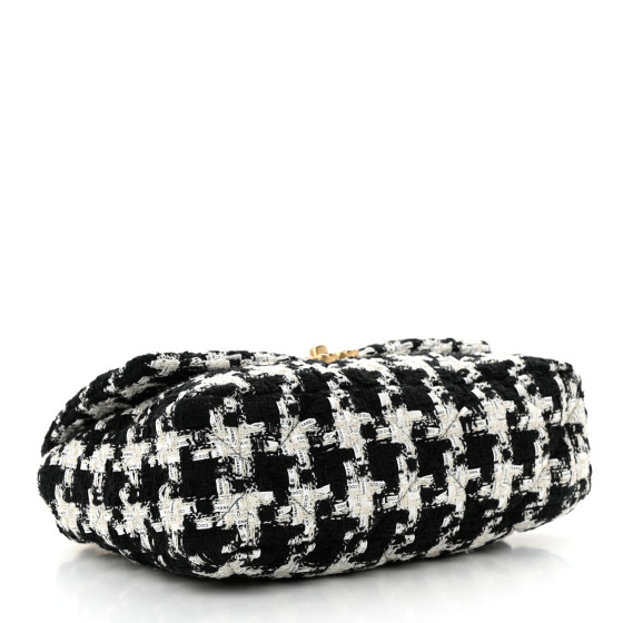 This is an CHANEL Tweed Quilted Large Chanel 19 Flap in Black, Ecru, and White. This chic shoulder bag is crafted of black and white tweed with a white woven details. The refined bag features an aged gold chain detail CC turn-lock on the flap, a magnetic snap pocket at the rear, and a leather threaded gradient gold to ruthenium chain-link strap with a leather shoulder pad. The front flap opens to a black fabric interior with a zipper pocket.
