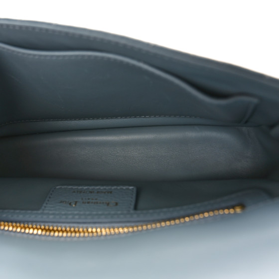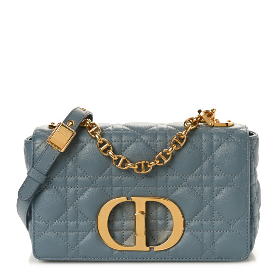 This is an CHRISTIAN DIOR Calfskin Cannage Small Caro Bag in Cloud Blue. This flap bag is finely crafted of calfskin cannage quilted leather in blue with a hint of grey. The bag features an adjustable shoulder strap and polished gold hardware. It opens to a smooth leather interior with zipper and flat pockets.