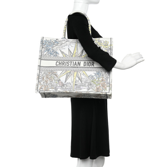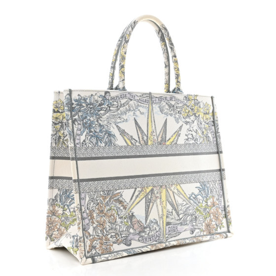 This is an CHRISTIAN DIOR Canvas Embroidered Large Rêve d’Infini Book Tote in Multicolor. This colorful tote is finely crafted of embroidered canvas with a bold zodiac graphic. The bag features matching canvas rolled top handles, with the CHRISTIAN DIOR logo embroidered across the front in grey, white, yellow, blue and purple. The bag opens to a spacious unlined fabric interior.
