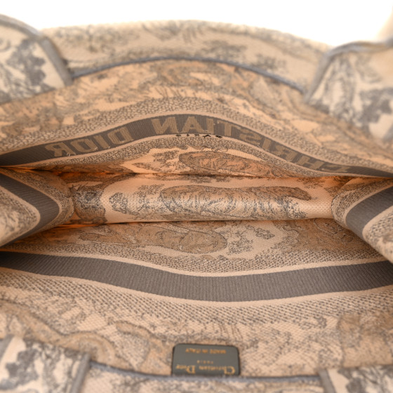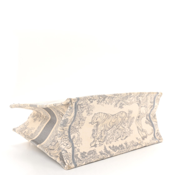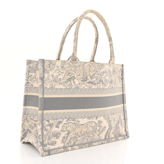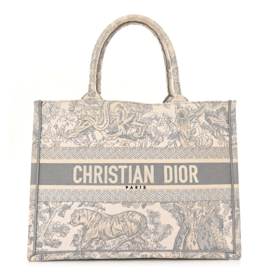 This is an CHRISTIAN DIOR Canvas Embroidered Medium Dioriviera Toile De Jouy Book Tote in Gray. This colorful tote is finely crafted of embroidered canvas with a bold jungle graphic in grey. The bag features matching canvas rolled handles, with the CHRISTIAN DIOR logo embroidered across the front. The bag opens to a spacious fabric interior.