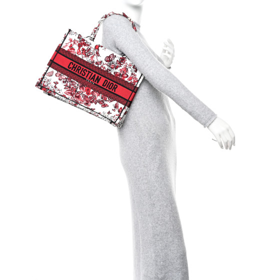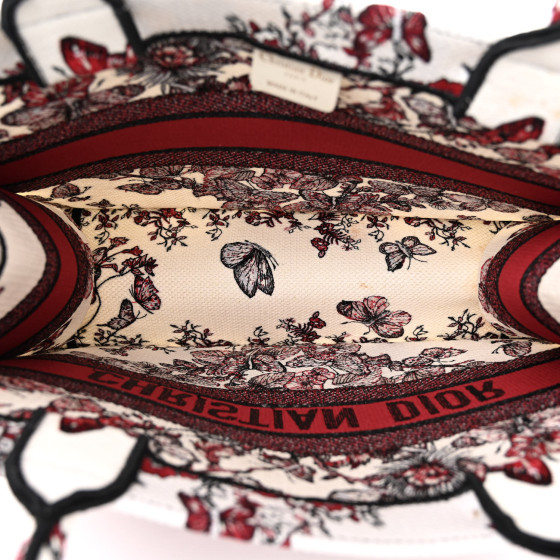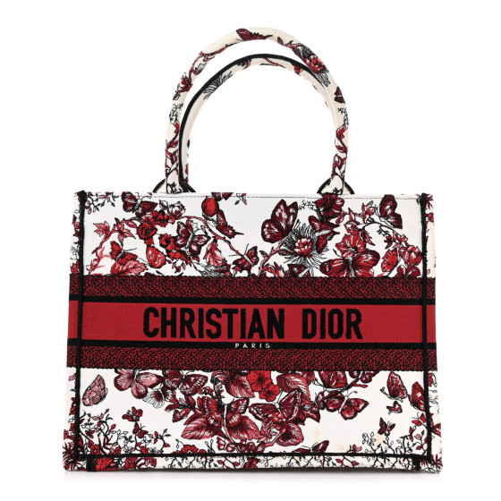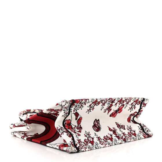 This is an CHRISTIAN DIOR Canvas Embroidered 45Medium Le Coeur Des Papillons Book Tote in White and Multicolor. This colorful tote is finely crafted of embroidered canvas with a bold floral and butterfly design. The bag features matching multicolored canvas rolled handles and the CHRISTIAN DIOR logo embroidered across the front. The bag opens to a spacious multicolored fabric interior.