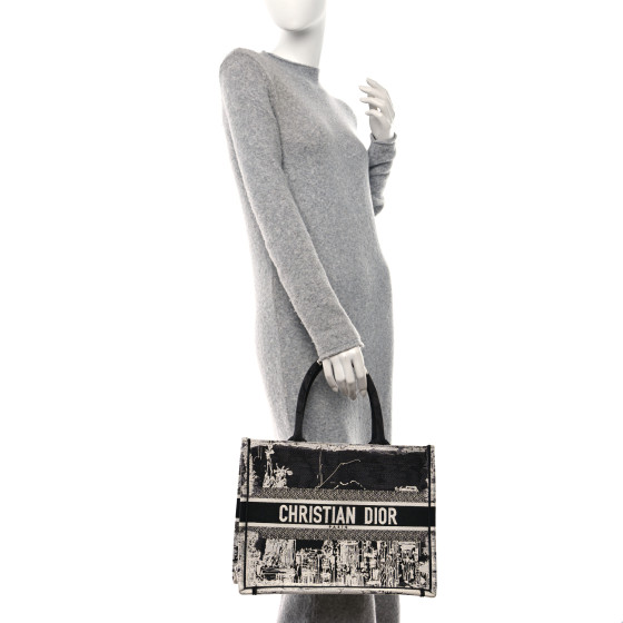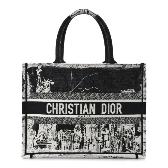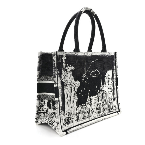 This is an CHRISTIAN DIOR Canvas Embroidered Medium New York Book Tote in Black and White. This tote is crafted of embroidered canvas with a design of the New York City skyline and the Statue of Liberty. The bag features black and white canvas rolled handles with an embroidered Christian Dior logo. The top is open to a fabric interior.