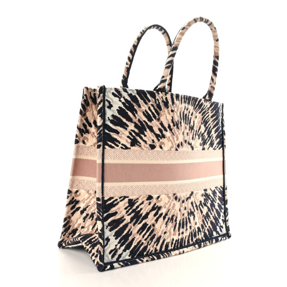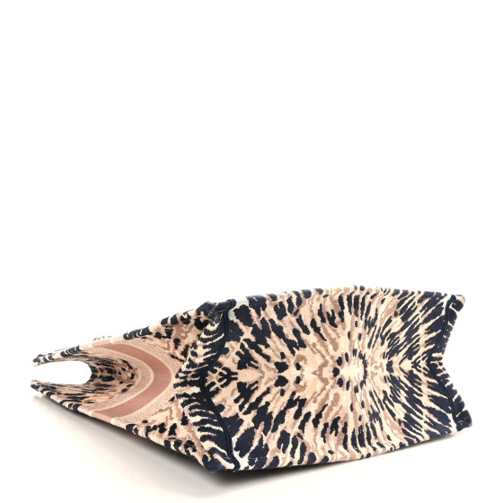 This is an CHRISTIAN DIOR Canvas Embroidered Tie Dye Large Book Tote in Multicolor. This stunning tote is crafted of embroidered canvas with a bold tie dye graphic in pink, beige, and blue. The bag features matching canvas rolled handles and a CHRISTIAN DIOR logo embroidered across the front. The bag opens to a spacious unlined interior.
