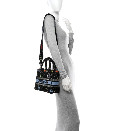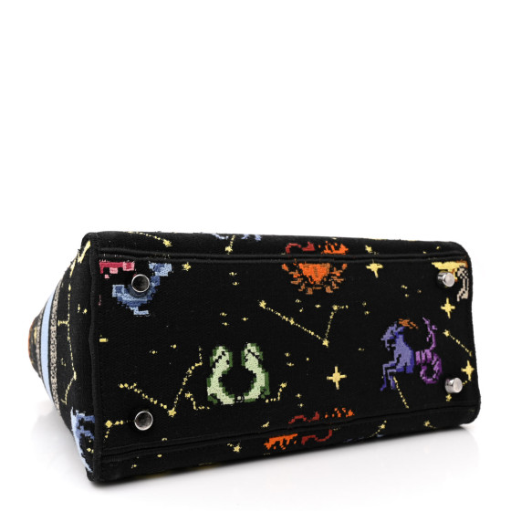 This is an CHRISTIAN DIOR Canvas Pixel Zodiac Embroidered Medium Lady D-Lite in Nero and Multicolor. This attractive bag is crafted of multicolor canvas with an embroidered zodiac scene throughout the front of the bag. The bag features an optional shoulder strap, canvas top handles, and dark silver Dior charms. The top opens to a matching canvas interior.