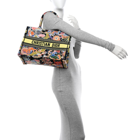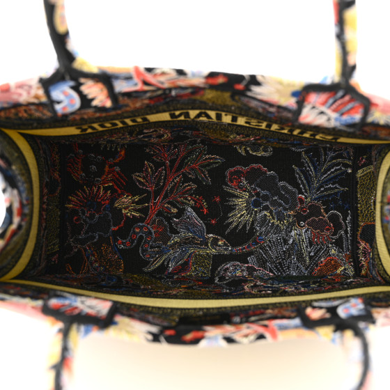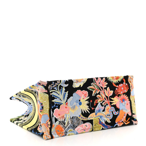 This is an CHRISTIAN DIOR Canvas Zodiac Fantastico Embroidered Medium Book Tote in Black and Multicolor. This colorful tote is finely crafted of embroidered canvas with a bold zodiac design. The bag features matching multicolor canvas rolled handles, with the CHRISTIAN DIOR logo embroidered across the front. The bag opens to a spacious fabric interior.