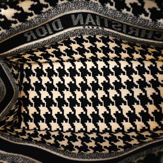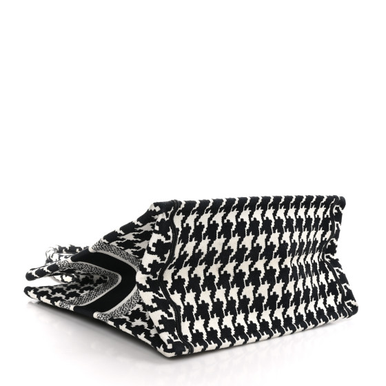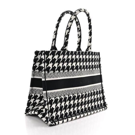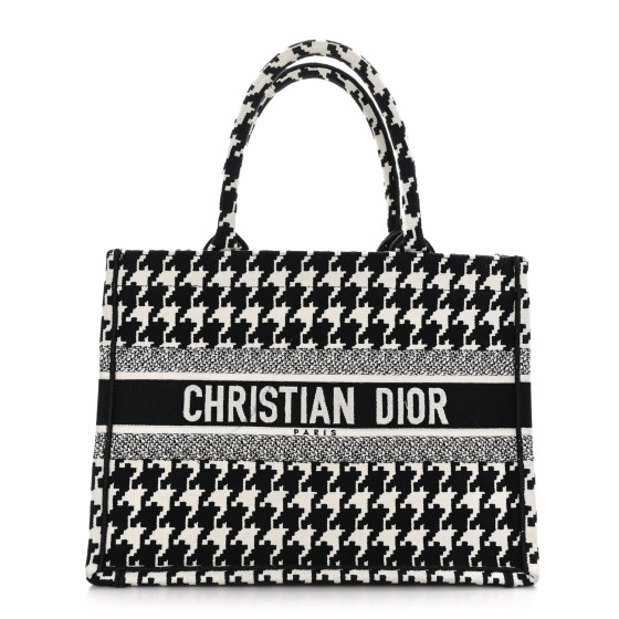 This is an CHRISTIAN DIOR Canvas Macro Houndstooth Embroidered Medium Book Tote in Black and White. This lovely tote is crafted of classic houndstooth embroidered canvas in black and white. The bag features rolled canvas top handles and a prominent white CHRISTIAN DIOR logo embroidered on the front. The top is open to a spacious canvas interior.