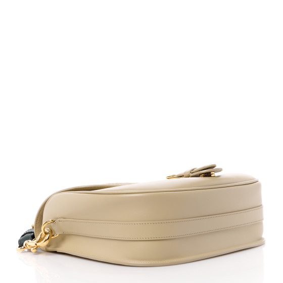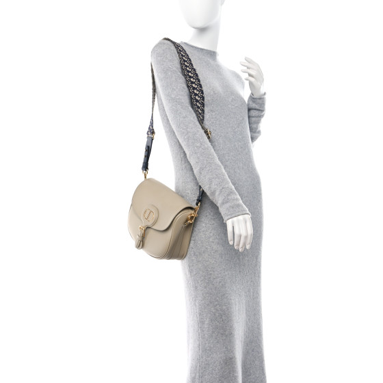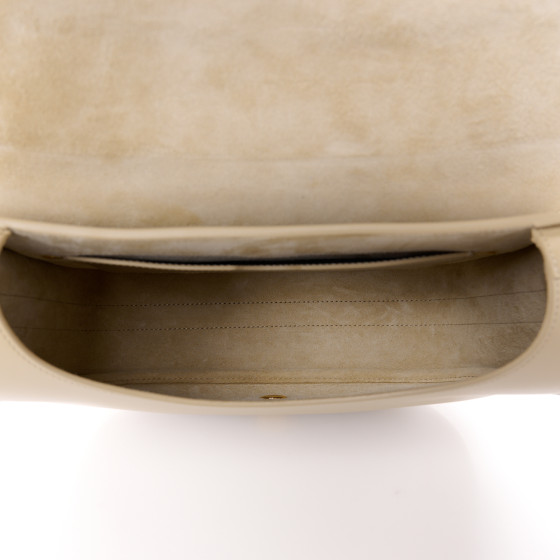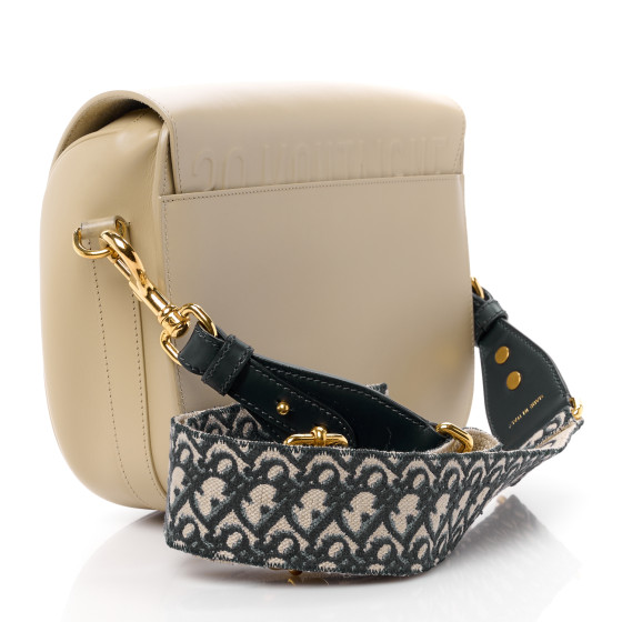 This is an CHRISTIAN DIOR Grained Calfskin Large Bobby Flap in Beige. This flap bag is finely crafted of smooth beige calfskin leather. The bag features a Dior monogram canvas shoulder strap and polished gold hardware. The flap opens to a white suede interior with a patch pocket.