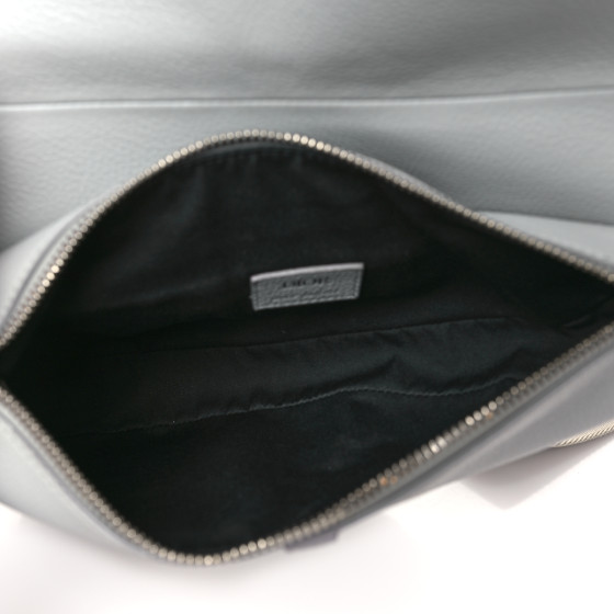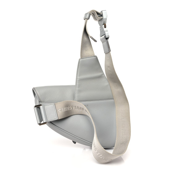This is an CHRISTIAN DIOR Grained Calfskin Kim Jones Saddle Bag in Light Grey. This stylish bag is crafted of grey grained leather and features a nylon strap with an industrial buckle clasp. The flap opens to a black fabric zippered interior.