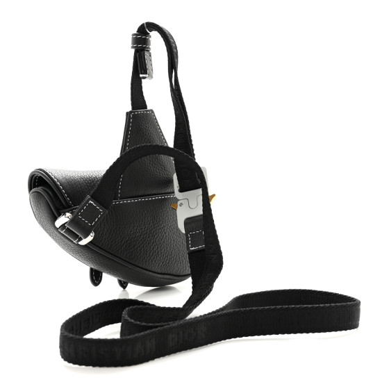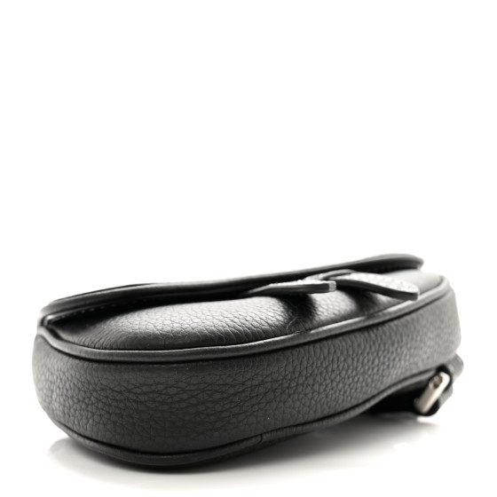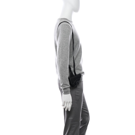 This is an CHRISTIAN DIOR Grained Calfskin Mens Mini Saddle Bag in Black. This chic saddle bag is crafted of grained calfskin leather in black. This bag features an adjustable black nylon jacquard shoulder strap that can be worn at the waist, over the shoulder or as a crossbody and silver hardware. The front flap opens to a zipper compartment with black fabric interior.