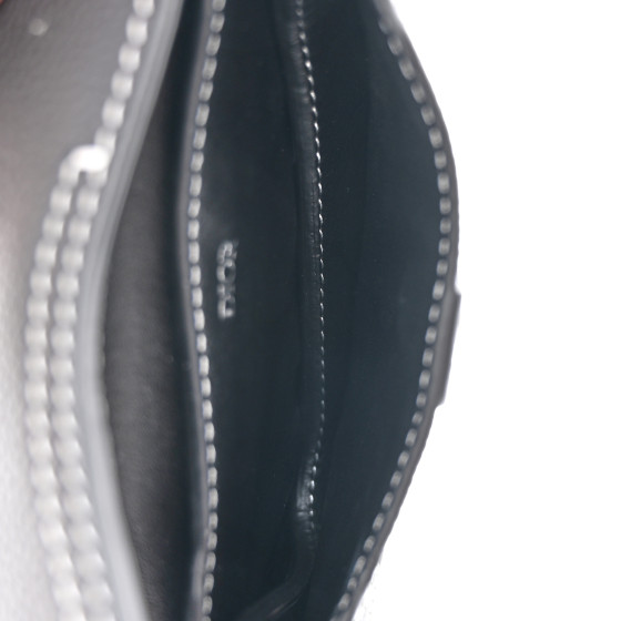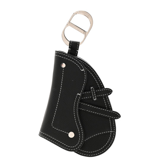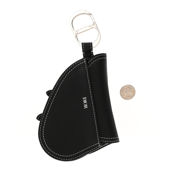 This is an CHRISTIAN DIOR Grained Calfskin Saddle Mini Key Ring in Black. This stylish card holder is crafted of grained calfskin leather in black. The wallet features a saddle style frontal flap, a rear pocket, and a silver Dior D charm. This opens to a leather interior.
