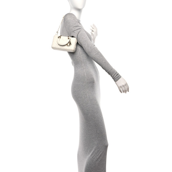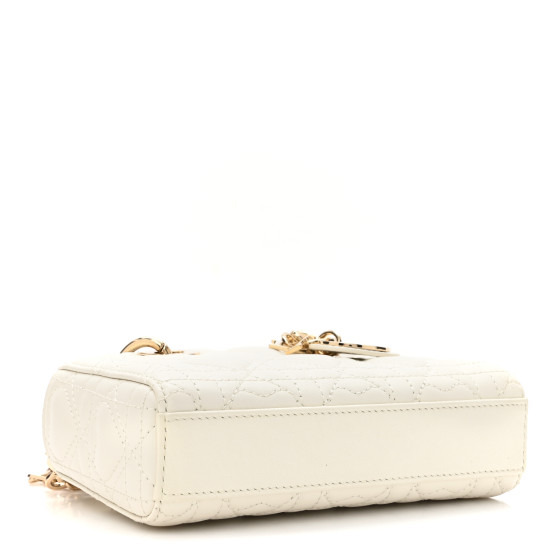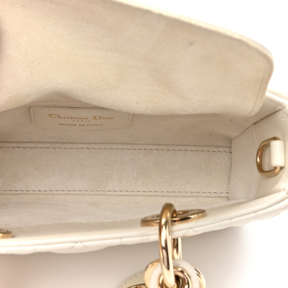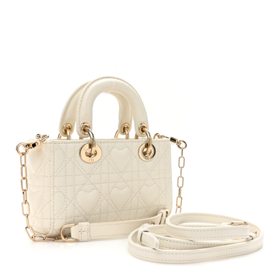 This is an CHRISTIAN DIOR Lambskin Cannage Dioramour Micro Lady D-Joy in Latte. This attractive mini bag is crafted of white leather with an embroidered geometric heart pattern. The bag features two removable shoulder leather and chain straps, top handles, and polished gold tone hardware, including Dior letter charms. The top flap opens to a white suede leather interior.