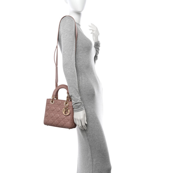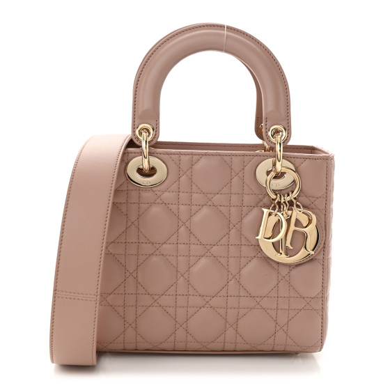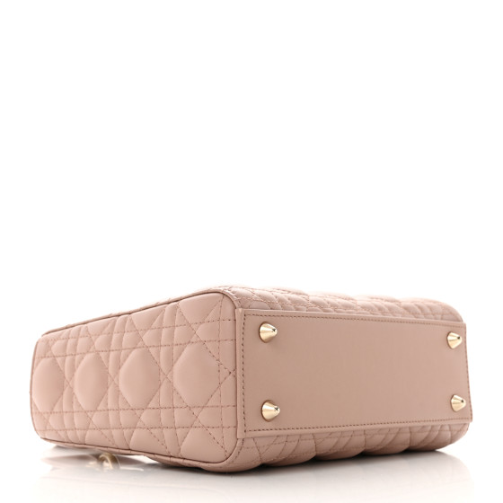 This is an CHRISTIAN DIOR Lambskin Cannage Small My ABC Dior Lady Dior in Blush. This chic tote is crafted of quilted lambskin leather in soft pink. The bag features a wide shoulder strap and leather top handles with polished pale gold hardware including hanging Dior initials logo charm. The top opens to a gray Dior monogram jacquard fabric interior with a zipper pocket.