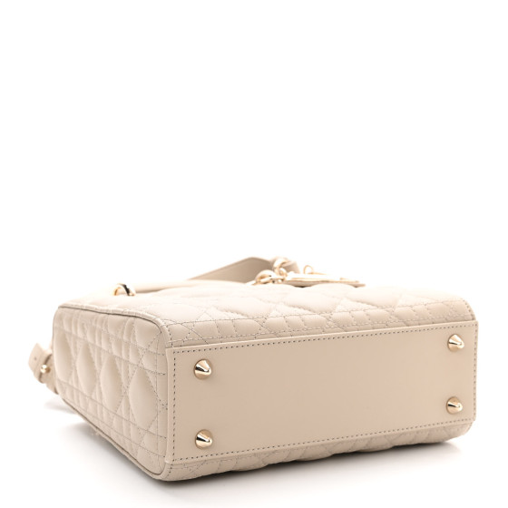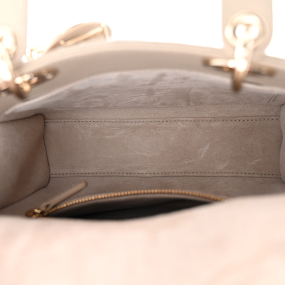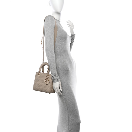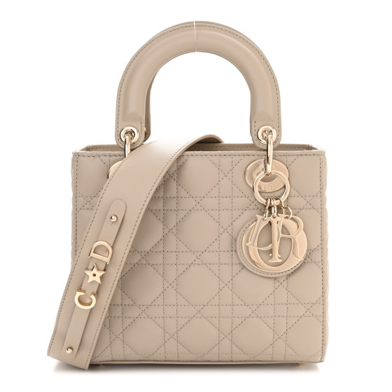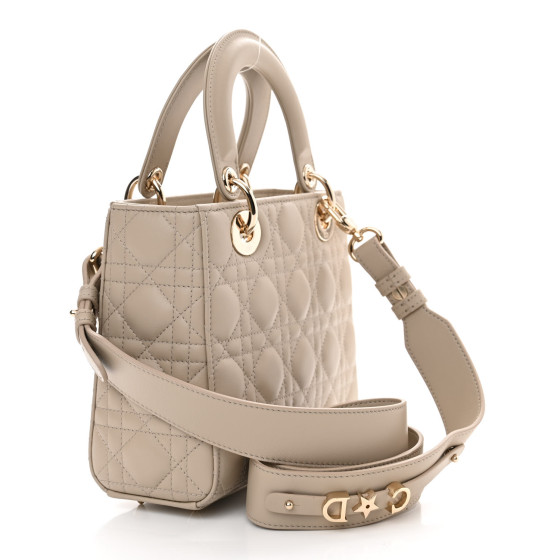 This is an CHRISTIAN DIOR Lambskin Cannage Small My ABCDior Lady Dior in Hazelnut. This elegant tote is crafted of geometric quilted lambskin leather in warm taupe. The shoulder bag features sturdy lambskin leather top handles, an optional shoulder strap and polished gold hardware including hanging Dior initials logo charms. The crossover flap opens to a grey Dior monogram jacquard fabric interior with a zipper pocket.