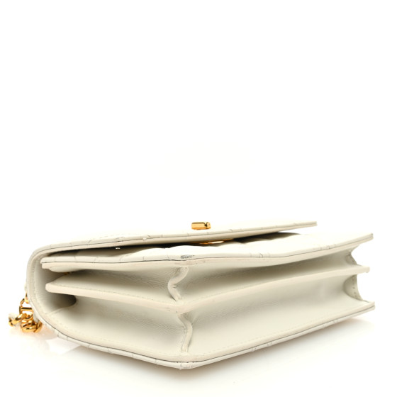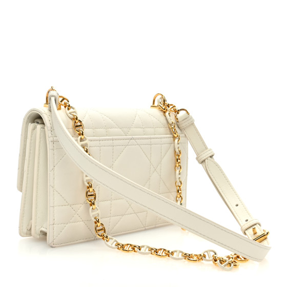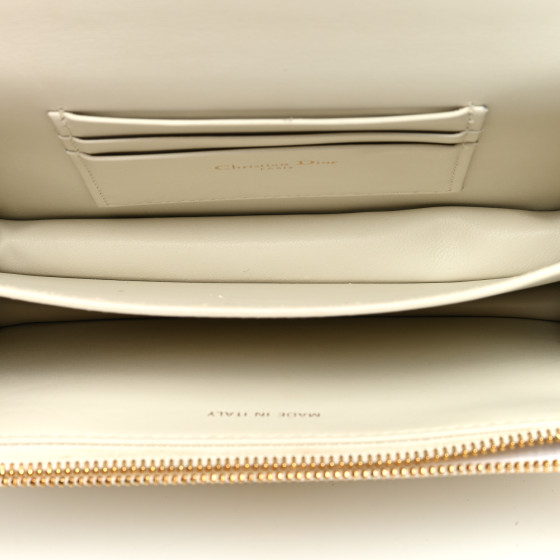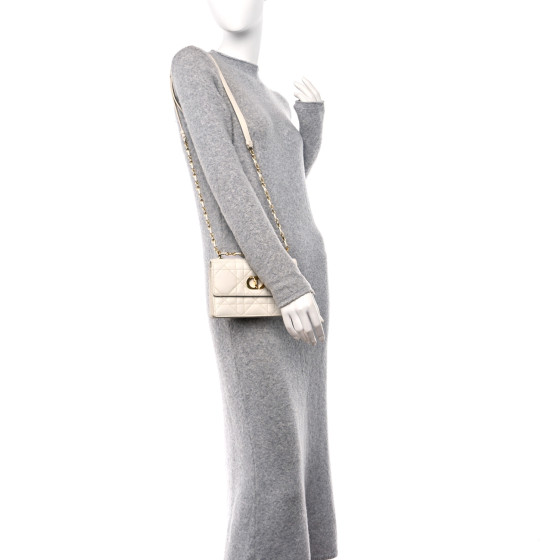 This is an CHRISTIAN DIOR Lambskin Macrocannage Mini Miss Caro Bag in Latte. This flap bag is finely crafted of quilted lambskin leather in off-white. The bag features an adjustable leather strap with gold and enameled CD links and polished gold hardware. The front flap opens to a smooth partitioned leather interior with a zipper pocket and card slots.