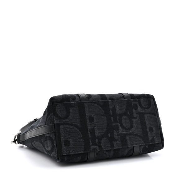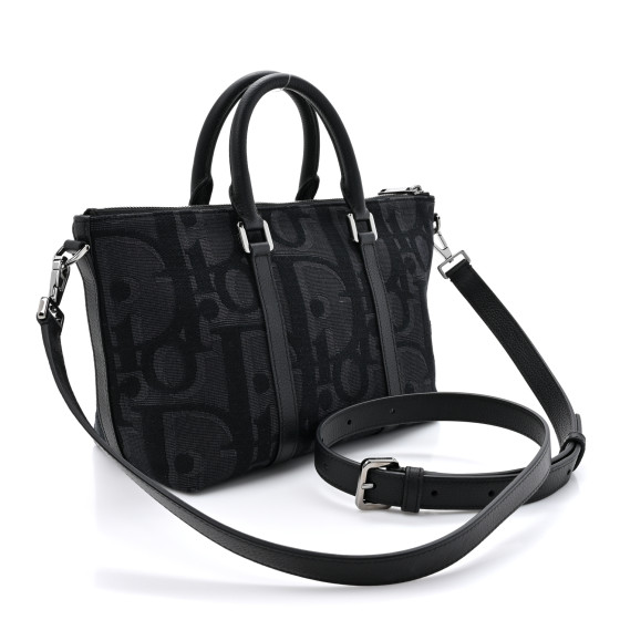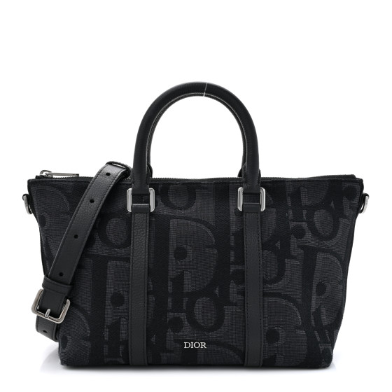 This is an  CHRISTIAN DIOR Maxi Oblique Jacquard Weekender 25 in Black. This bag is crafted of black canvas with an oversized Dior logo. The bag features black leather top handles and trim and a removable, adjustable black leather shoulder strap. The top zipper opens to a black fabric interior with a zippered pocket.