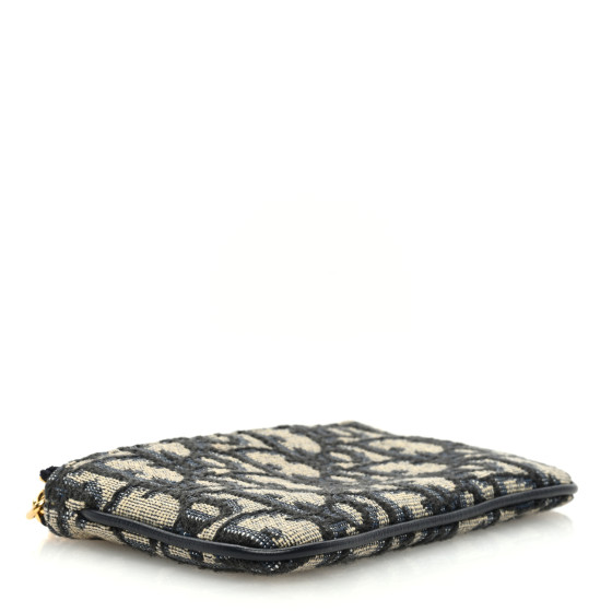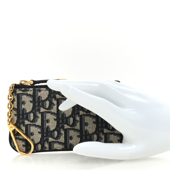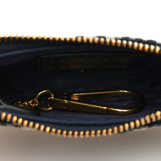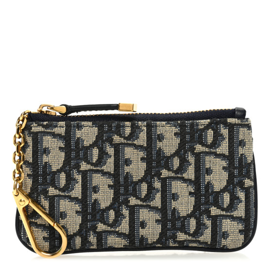 This is an CHRISTIAN DIOR Oblique Key Case in Blue. This stylish saddle coin holder is crafted of navy blue on beige Dior monogram canvas. The wallet features a top zipper that opens to a navy fabric interior.